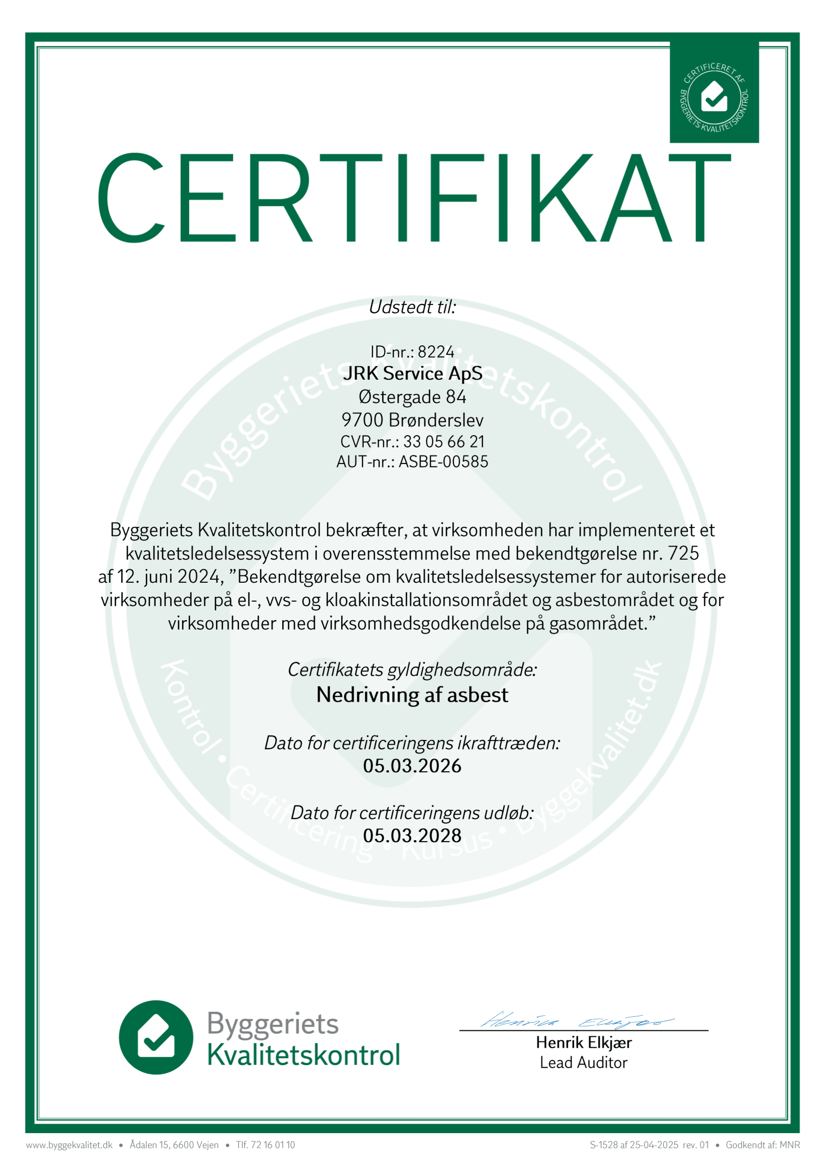 JRK Service råder over en asbestcertificeret person med den nødvendige uddannelse. Arbejde med asbest er underlagt særlige krav, herunder uddannelse for den udførende person og autorisation fra Sikkerhedsstyrelsen for virksomheder. Vi rådgiver altid om korrekt og lovpligtig håndtering.